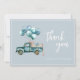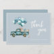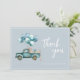 Modern elegant script dusty blue baby boy thank you card featuring a watercolour blue vintage truck with balloons.