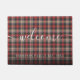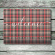 Elegant personalized family name doormat featuring your family name with your established date set in a classic white text on a plaid background with the message "welcome" Designed by Thisisnotme©