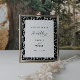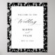 Elegant design with calligraphy and modern fonts. The couple's name and special date are underneath. The black and white floral pattern is framed by a grey border.