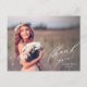 This elegant graduation thank you postcard features a full photo and elegant calligraphy. "Thank you" is written in pretty white script in the lower right corner, with the graduate's name and graduation year below. This white typography design overlays a full photo of the new graduate (horizontal/landscape orientation). On the back, you can write a custom message to recipients, or delete the template text to create a blank area for a handwritten note.