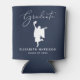 Custom dark navy blue can cooler for her graduation party featuring an illustration of a graduate celebrating in her cap and gown, "Graduate" in an elegant white script and her name and class year in simple white typography.