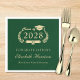 Elegant green and gold graduation party napkins featuring "Class of" in a laurel wreath with a grad cap and diploma, the graduate's name in a formal script, and "Congratulations" and their school name in classic typography.