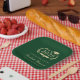 Elegant green and gold graduation party paper plates featuring "Class of" in a laurel wreath with a grad cap and diploma, the graduate's name in a formal script, and "Congratulations" and their school name in modern classic typography.
