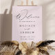 Elegant wedding welcome sign featuring "Welcome" in a modern black calligraphy script with a lavender background (or color of your choice). Personalize the lavender-purple wedding sign by adding your names, wedding date, and wedding location. The vertical welcome sign is designed to coordinate with our Modern Elegance wedding collection and is available in other colors.