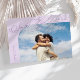 Elegant and stylish save the date card featuring a script text that says "save the date." One photo in the font and one on the back. The background is lilac.