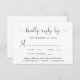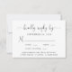 Elegant wedding RSVP card featuring "kindly reply by" in a chic calligraphy script with swashes, simple modern typography, personalized menu entree options and your names joined together by a heart on the back.