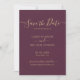 Elegant script minimalist modern non photo burgundy and gold wedding save the date announcement card. Simple clean design template feature an elegant cursive hand lettering typography script „Save the Date” text in gold on wine red or burgundy bordo background color. This classic card perfect for a couple who wants a traditional save the date with a modern touch, without a photo. If you need help or matching items, please contact designer.