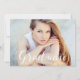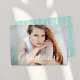 Elegant graduation announcement with "Graduate" displayed in a white script overlay. Personalize the front of the modern photo graduation announcement with your horizontal photo, name, and graduation year. The announcement reverses to display a mint green and white hand-drawn herringbone pattern.