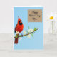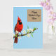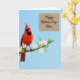 This card features a richly feathered red bird perched on a thin branch in the lower-left area, its deep crimson body set off by darker face markings and a sturdy orange beak. The branch is dotted with small white blossoms whose yellow centers feel like tiny sunlit glances, adding a gentle, affectionate mood to the scene ❤️. Behind everything, a wide wash of pale blue sky keeps the focus on the bird and flowers, like a quiet moment shared between close friends. In the upper-right corner, a soft beige rectangle holds the message, giving the design a calm place for words without crowding the artwork. The lettering inside that rectangle is flowing and graceful, shown in a darker tone that stands out clearly against the beige. The contrast between the warm red feathers and the cool sky creates a tender, romantic balance, like a fond look held a second longer than usual 🌼. The blossoms appear crisp and bright along the branch, with each white petal framing a small golden center.
