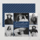 Elegant graduation announcement featuring 6 photos bordering the design. "Graduate" is displayed in a white modern calligraphy script on a navy blue background. Personalize the front of the photo graduation announcement by adding the graduate's name, school, and graduation year. The announcement reverses to display a navy and white diagonal stripe pattern. The multi-photo graduation announcement is perfect for both high school and college graduations.
