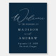 Elegant wedding welcome sign featuring "Welcome" in a white modern calligraphy script with a navy background (or color of your choice). Personalize the navy wedding sign by adding your names, wedding date, and wedding location. The vertical welcome sign is designed to coordinate with our Modern Elegance wedding collection and is available in other colors.