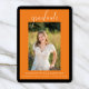 Announce your graduation with this elegant script orange graduation announcement. Add a photo and customize text on the front and back to create your own unique graduation announcement. This invitation is available in a variety of different colors. Visit my graduation collection to view all options.