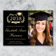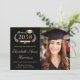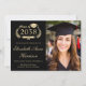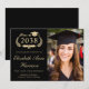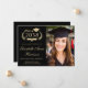 Announce your graduate's academic achievement with this elegant black college graduation announcement, featuring their portrait, a traditional laurel crest with a grad cap mortarboard and diploma encasing their class year, and classic gold script and serif typography -- creating a timeless look. The clean design showcases the graduate’s name, university, degree, and class year in a clear, sophisticated format -- perfect for sharing milestone news with family and friends. Fully customizable, this graduation announcement allows you to adjust it for a high school graduate as well.