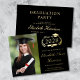 Modern black college graduation party invitation featuring real gold foil, "Class of" within an illustration of laurel wreath incorporating a grad cap topper and diploma, a photo of the graduate and their name in an elegant script. Add their school, major, honors or future plans. On the back side, add the party details in simple light gold typography.