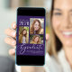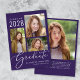 Modern purple graduation announcement with the front featuring a 3 photo collage, "Graduate" in an elegant white script, and the grad's name, class year and school or university in simple white lettering. On the back, add an additional photo and your personalized message.