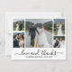 Modern, Elegant Script Wedding 5 Photo Collage Thank You Card in Black and White. Minimalist, stylish wedding card template featuring five (5) grid photo collage and a "Love and thanks" hand lettering script calligraphy swash tail font. Personalize your name and thank you message. If You need help or matching item, please contact to designer!