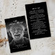 This modern black and white prayer card offers a deeply personal way to share reflection and solace during times of remembrance. This stylish card features a photo on the front with the iconic "In Loving Memory" inscription in an elegant script, and the name and dates that frame a lifetime. On the reverse, a poem, prayer, or quote provides words of comfort. This prayer card, suitable for a man or woman, is a fitting companion during funerals, memorial services, a celebration of life, prayer gatherings, or quiet moments of reflection at home. The elegant script and simple monochrome palette honor the individual's memory while providing a tangible piece of comfort to those grieving. Distribute these prayer cards to friends and family as a means of coming together in support and shared remembrance, turning to the solace of prayer and the power of communal healing. This prayer card is a beautiful expression of life's journey and the spirit that continues to inspire even in absence.