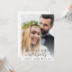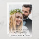 Elegant elopement or small wedding announcement and reception invitation to let family and friends know that you were married in a small intimate wedding ceremony, and to invite them now to a wedding reception. The front features your wedding day photo overlayed with "Happily Ever After Party" in a mix of simple typography and a trendy script with swashes. Under your photo, add your first names and wedding date. On the reverse side, personalize your message in more detail and add party or reception details and your names in a signature-like script.