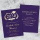 Formal purple college graduation party invitation featuring your choice of real gold, silver or rose gold foil on the front, "Class of" in a laurel wreath incorporating a grad cap topper and diploma, the graduate's name written in an elegant script, and their school, major, honors or future plans in classic serif typography. On the back, personalize your graduation party details in light gold lettering (you can change the text color to white by editing in the design tool if you selected silver or rose gold foil for the front).