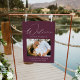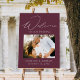 Elegant wedding welcome sign featuring "Welcome" in a modern white calligraphy script with a wine/purple background (or color of your choice). Personalize the purple wedding sign by adding your horizontal photo, names, wedding date, and wedding location. The photo wedding welcome sign is designed to coordinate with our Modern Elegance wedding collection and is available in other colors.
