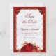 This luxury floral wedding save the date card features elegant script, red roses decorating a gold filigree frame, and a white satin and faux red metallic background. Check out the collection for matching products, or contact me through Zazzle Chat for the special item you are looking for.