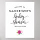 A chic black and pink baby shower welcome poster featuring elegant hand lettered style script font and a watercolor image of pink roses with green leaves. Personalize this poster with the name of the expectant mother and date of the event.