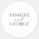 Elegant Script Simple Black & White Wedding Classic Round Sticker. Modern design with elegant black script on classic white. Suitable for weddings of any season, day or night, great for favors and thank yous. All text fonts, and colors are customizable. We invite you to visit our Zazzle store, Austen & Grace, for matching products and more. Please contact us if you require any assistance.