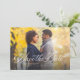 Share the news of your engagement and upcoming marriage with this one-photo horizontal save the date card featuring an elegant type treatment in white that sits at the bottom of a horizontal photo. The back is a neutral shade with a subtle grid pattern. The color can be adjusted by clicking "Customize."