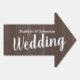 Elegant vintage brown wood grain print directional wedding yard sign for venue. Elegant personalized black and white wedding yard sign pointing left or right. Turn arrow to your preference or make it double sided. Help guests find their way to your reception party. Rustic design with name of bride and groom. Useful for left and right direction. Personalizable directional road signage board. Also handy for pointing poeple to ceremony, parking, reception, games, restrooms or cocktail bar in different locations. Available in different sizes and shapes from small to medium or large. Stylish brush script typography template.