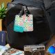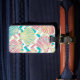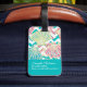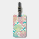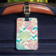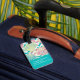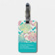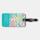 This elegant luggage tag features faux glitter, colorful seashells in multiple colors of teal, coral pink, aqua, and gold. The shells are placed on aqua blue chevron stripes that also contain images of the shell pattern, and those are contrasted with white chevron stripes. The back of the tag has the same seashell pattern, but with a matching solid teal block at the end that contains your custom text in white. You may use the text lines to put your preferred info in place of the example. Pretty!