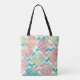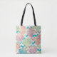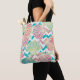 This elegant tote bag for her features faux glitter, colorful seashells in multiple colors of teal, coral pink, aqua, and gold. The shells are placed on aqua blue chevron stripes that also contain images of the shell pattern, and those are contrasted with white chevron stripes. Both sides of the bag have the same image.
