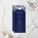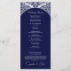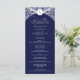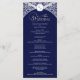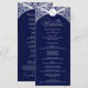 This wedding program card features a deep blue background highlighted with ornate silver flourishes for a refined and formal appearance. A crest at the top elegantly frames the monogram initials, while the central section showcases the couple’s names and the complete wedding service details in a clean and organized format. The pairing of rich blue with shimmering silver creates a timeless and sophisticated design, perfect for evening weddings and classic celebrations.