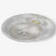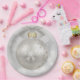 Paper plates with a magical holiday design. Featuring a silver Christmas ball with snowflake decorations and finished off with a pretty silver bow. The background is a silver bokeh lights illustration with elegant stars scattered throughout.