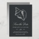 Notify guests of your upcoming destination, beach, or tropical island wedding with these beautiful summer save the date cards featuring a faux silver foil conch shell illustration on a rich, soft black background. Elegant white script and block lettering displays your wedding details (names, wedding date, location, and website).