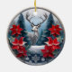This round ceramic deer ornament features an elegant silver colored frame that encircles a poinsettias festive design. The background showcases a serene Christmas scene, picturesque trees and winter snow landscape. A reindeer gracefully shows off his antlers, adding a touch of magic and Xmas holiday spirit to the ornament. Same Image is on the front and back. This ensures that no matter how the ornament turns, it always looks festive and complete. 🦌🎄