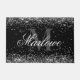 Elegant Silver Glitter Black and White Monogram large doormat with a customizable calligraphy script name and bold monogram template. A glam, girly personalized large doormat for your new home or dorm room.