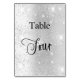 The table number is written with an elegant hand lettered style script. Black letters, a faux silver background with faux glitter dust, sparkles.
