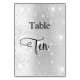 The table number is written with an elegant hand lettered style script. Black letters, a faux silver background with faux glitter dust, sparkles.