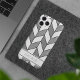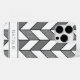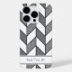 Personalized iPhone case features an elegant chevron design with a geometric herringbone pattern in gray, white and faux silver glitter with black lines.