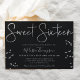 Plain white envelopes are included with paper invitations and will come to fit the invitation size you select. If you don’t need the envelopes, you may choose to not receive them by selecting the dropdown below "Envelopes" and choosing "None." If you’d like to have a design on your envelopes, you can browse all of these available envelopes to find the design that complements your Elegant Silver Glitter Script Black Sweet 16 Invitation.