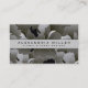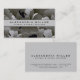 Elegant business card features a smokey gray floral with shades of black, light gray and accented hints of metallic silver. Custom name and title or role presented on a complimentary grey banner with black text and accents. The back of the card is plain and simple with coordinating black text on a plain silver gray background.