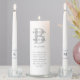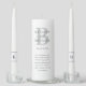 Elegant silver gray wedding unity candle set featuring the couple's names in stylish typography with a personalized quote or verse on the main candle. The wedding date is prominently displayed, and monogram initials grace each taper candle. Customize every element to reflect your unique love story.