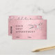 Modern and elegant appointment card for hairstylists with faux silver scissors, pink and white roses, faux pink rose gold background and elegant calligraphy font.
