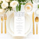 Elegant vintage inspired wedding dinner menu card design features an ornate decorative border design with a metallic silver shimmer appearance and platinum gray custom text that can be personalized.