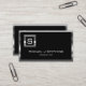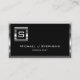 Black with chrome border and monogram. Modern Professional Elegant Black and Chrome minimalistic business card with style and understated class for any professional businessman. NOTE: Change the background color and see what you get- this card is made to change color and keep the design- Black is the color chosen here but you will get different effects with different colors - use the customize button and then the edit button, a drop down menu will appear - at the bottom is says background and shows a color box, click this to change the background color from the color pallet. This card has no metal on it - it is a flat cardstock business card artistically designed to appear real