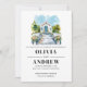 Our elegant design features a white church with an aisle decorated with white chairs and flowers, with a blue sky and green trees in the background. Perfect for a formal wedding.
