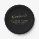 An Elegant Simple Script Graduation black paper plate with the word "Graduate" in gold script font, with name, school, and class of year.