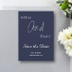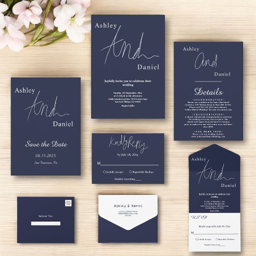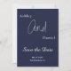 This elegant navy blue wedding invitation is perfect for a modern wedding. the simple design features elegant white calligraphy on a blue background.