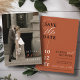 This elegant and simple black, terracotta, and white modern typography wedding save the date, features a hero cover photo with bride & groom names, oversized "and" in terracotta / burnt orange / rust, and spelled-out wedding date wording overlay, along with save the date half circle wording and modern design details, including wedding website, on the back over a beautiful solid terracotta background. Perfect for a Fall / Autumn wedding! Personalize the wording for your big day, easily upload your photo! You may even edit / adjust placement of design components or change certain colors further, by clicking the blue "Edit using design tool" button at the bottom of the "Personalize" window, then navigate to the "layers" tab in the left hand column of the edit screen, select the front or back side layer, then click on the element you would like to change and make it your own ♥ Custom design requests and questions are always welcome - click the "message" button or email: figandlilyco@gmail.com. Photo is for placeholder purposes only, and must be replaced. Design is lovingly created by Fig and Lily Studios, and photo credit of our beautiful daughter's engagement/wedding: @laurenmargaretphotography