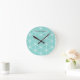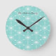 An elegant, modern wall clock with a festive geometric pattern of white snowflakes, on a fresh icy aqua blue background. Personalize with the recipient's name(s) as a stylish and useful holiday gift for the home.